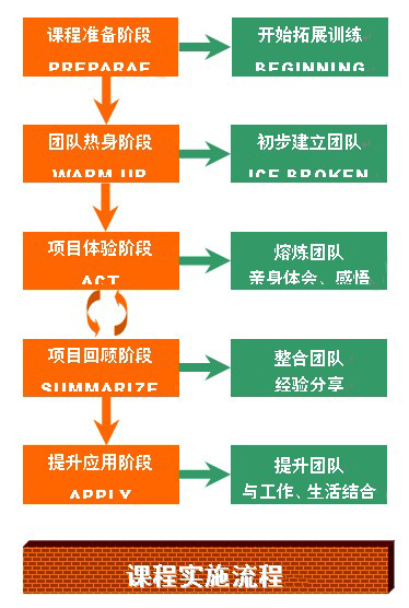 在培训中,参训学院会被分成几个小组(15人左右一组),整个培训中体力与脑力活动充分结合,在项目的实施中产生意识,回顾作为整个培训的核心部分,培训师会引导学员发表体会,大家分享,进行讨论分析形成理论,将学到的理论运用到下一个项目中,进一步指导日后的工作及生活(具体实施请参见下图)